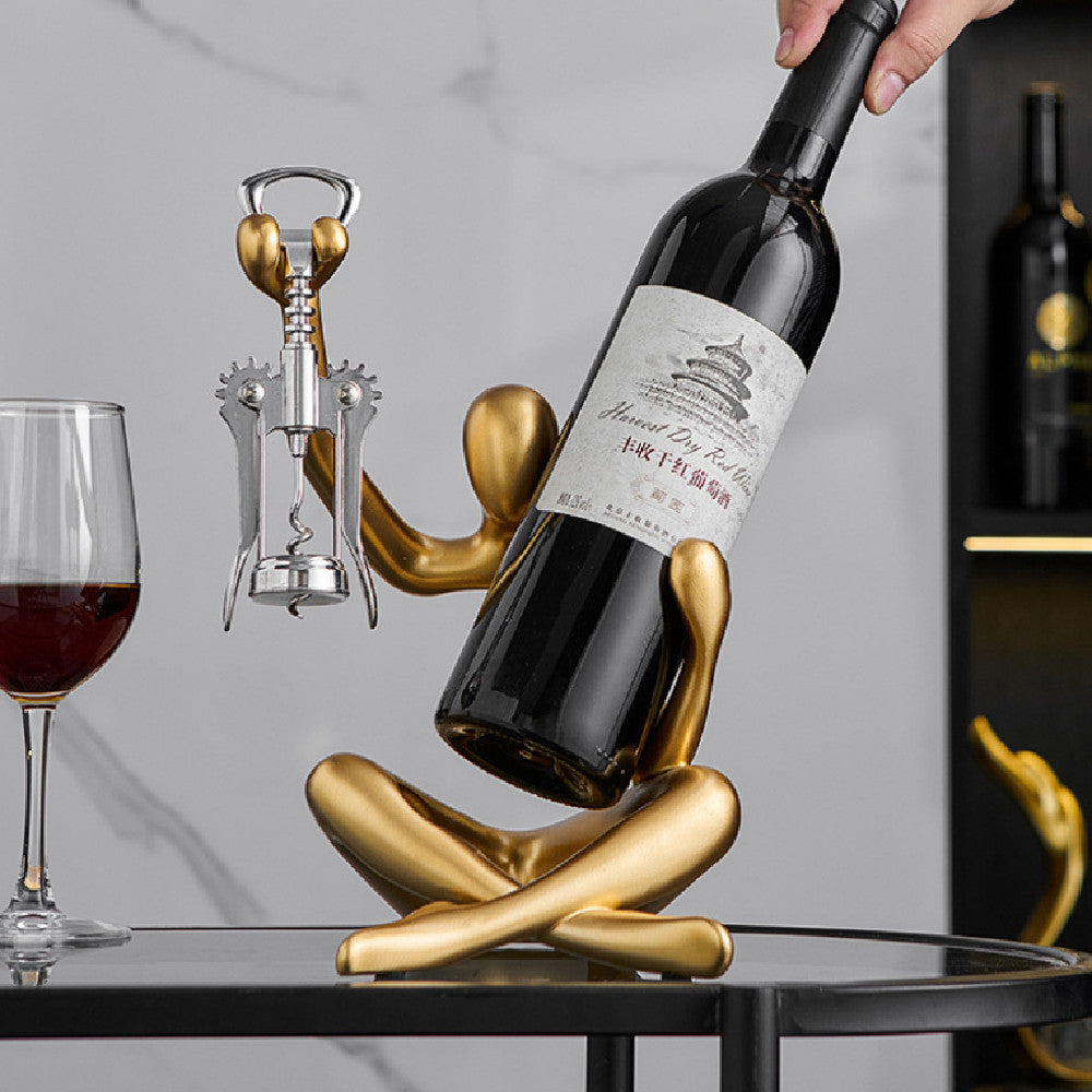This sculptural wine rack features a seated figure holding a wine bottle in one arm and offering space for a bottle opener (not included) in the other hand. Made of resin and available in gold or white, the figure measures 27.1 × 18.8 × 18 cm and combines modern home décor with functional wine storage.