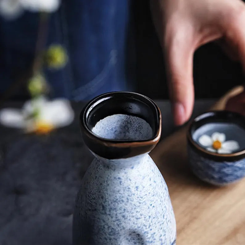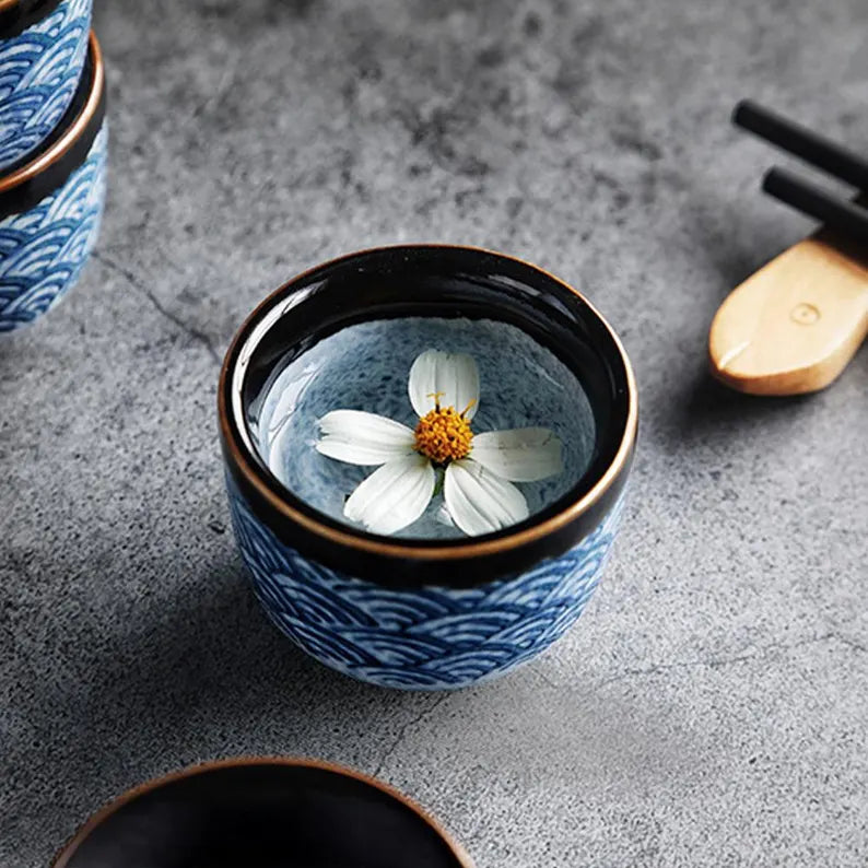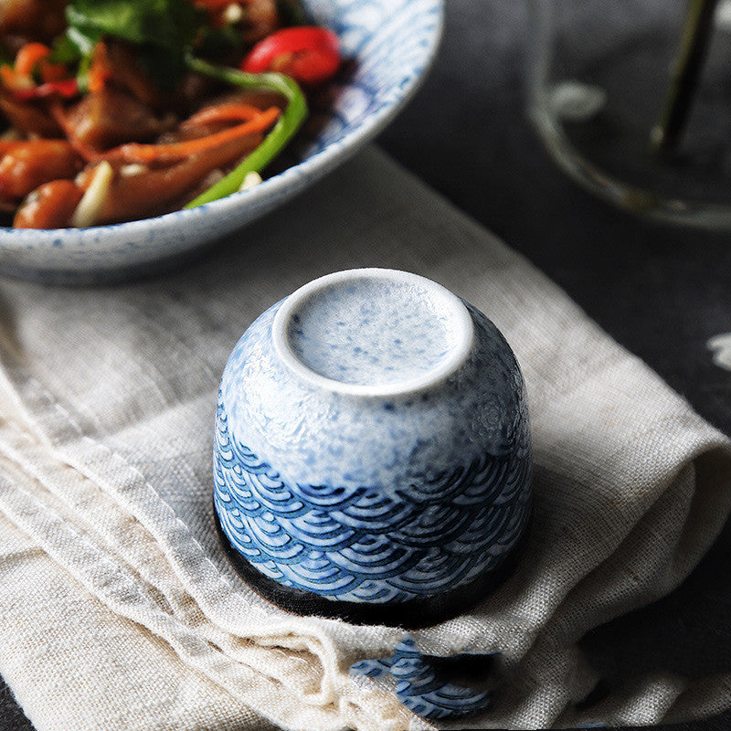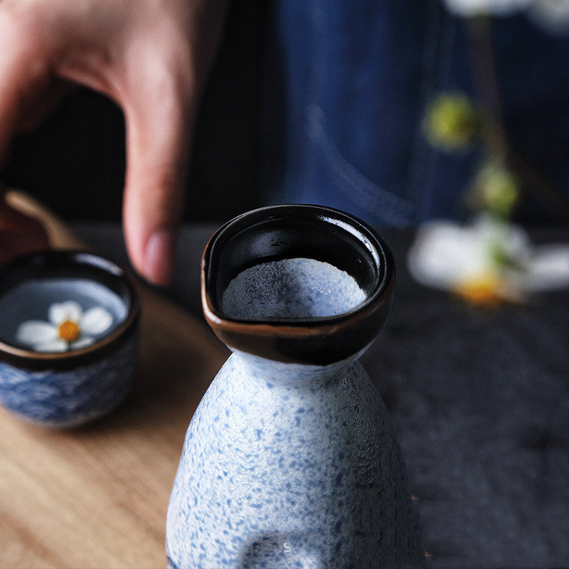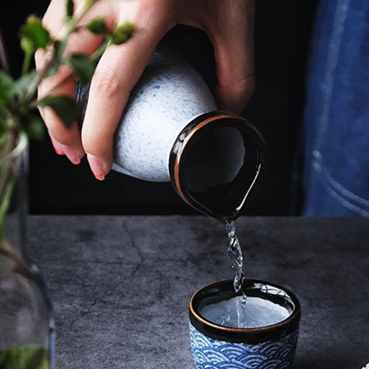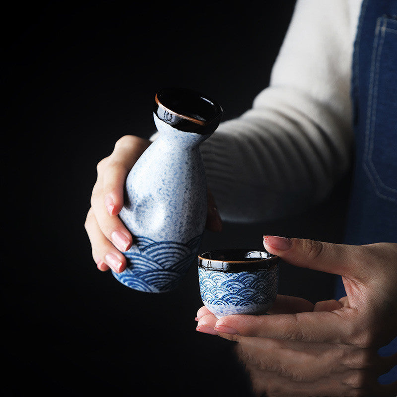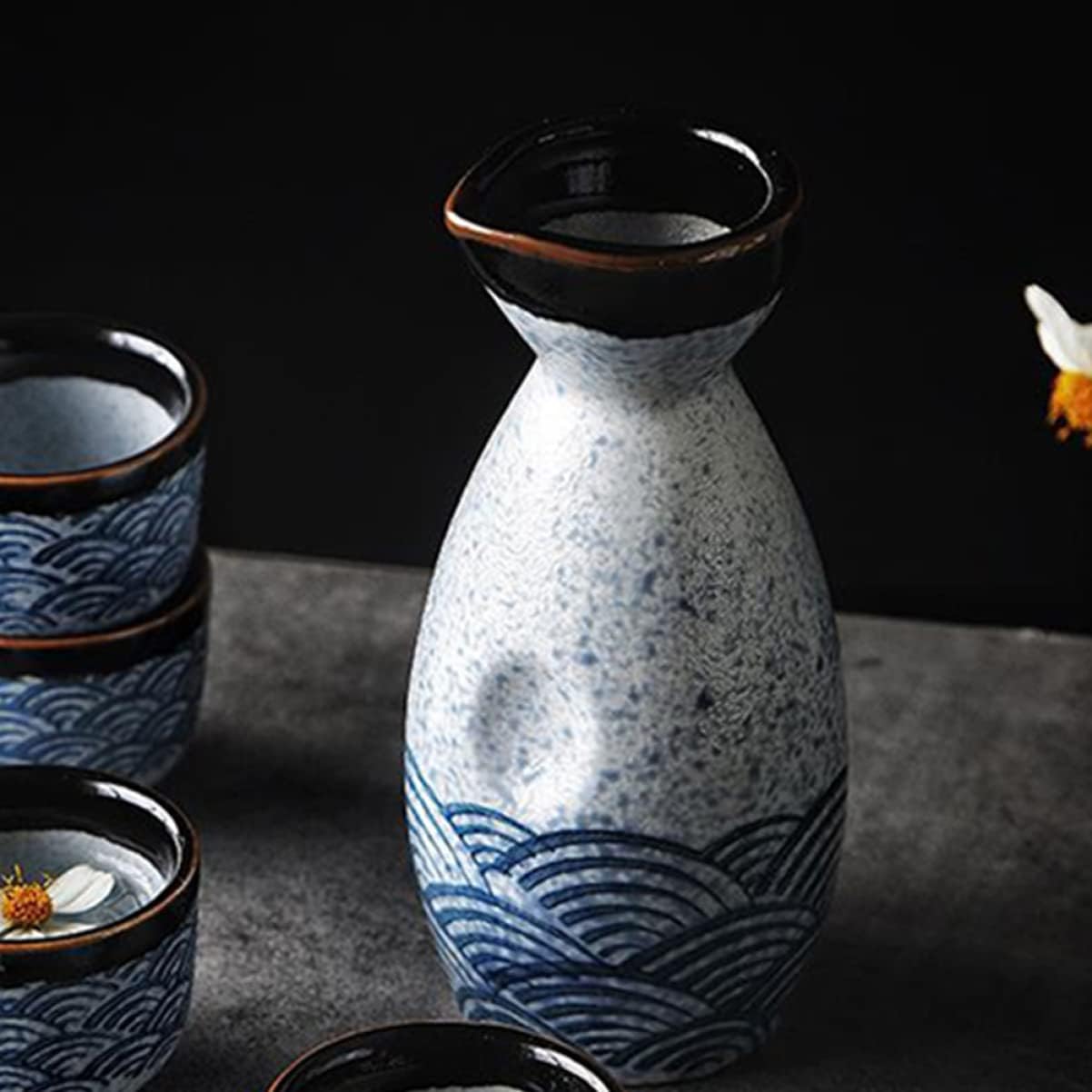 This wave-design sake set draws on classic motifs from Japanese ceramic art and consists of a 200 ml carafe and four 30 ml cups. The carafe measures 13.5 cm in height and 5 cm in width, while the cups measure 4 × 5 cm each. Made of ceramic, this set combines a calm, flowing design with traditional sake culture.