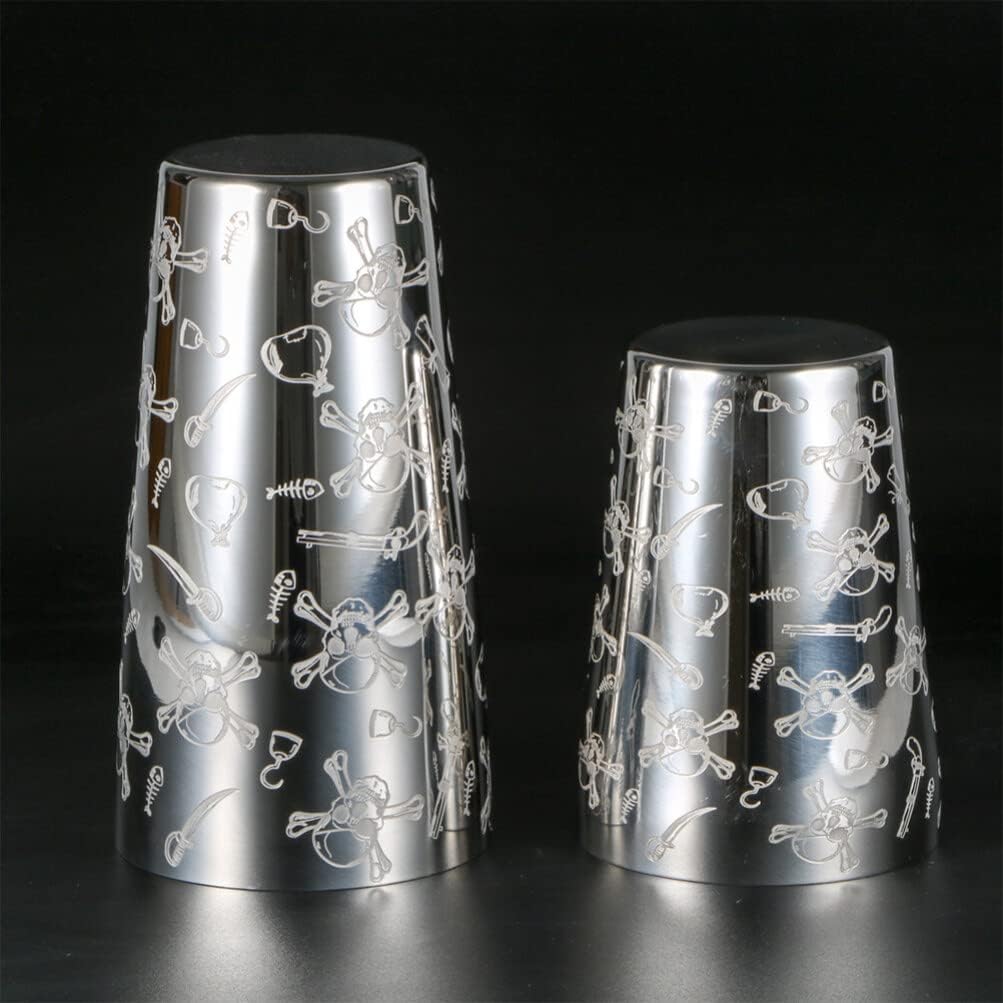 Dieser edle Boston Shaker besticht durch seine kunstvolle Gravur, erhältlich in zwei charakterstarken Designs: Schädel & Knochen und Floral. Beide Edelstahlbecher – der große mit 800 ml und der kleine mit 500 ml Fassungsvolumen – sind perfekt aufeinander abgestimmt und bieten eine professionelle Dichtung sowie optimale Handhabung. Die hochwertige Gravur verleiht dem klassischen Werkzeug eine besondere Eleganz und macht ihn zu einem exklusiven Blickfang jeder Bar.
